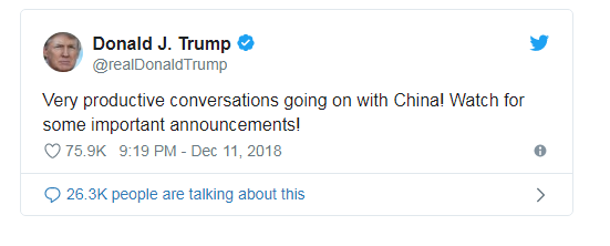 A dinner between Xi and Trump at a Group of 20 summit earlier this month has offered a degree of optimism surrounding the trade talks after both countries agreed to suspend any new tariffs until 2019. Trump on Tuesday took to Twitter to highlight "very productive" conversations with Beijing, telling his followers to "watch for some important announcements!"